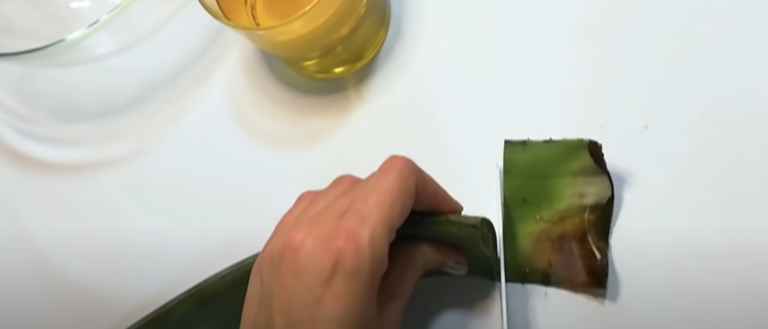 Wylej wodę, w której znajdował się liść. Teraz możesz zająć się wydobyciem miąższu. Odetnij dolną część liścia, pozbądź się też boków.
