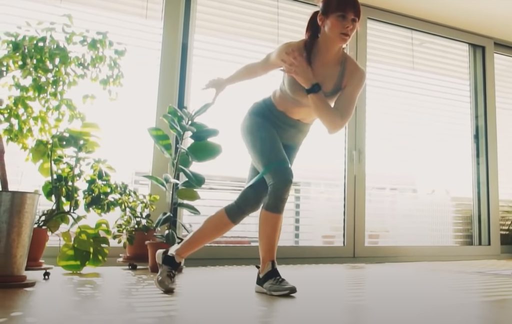 Do tego ćwiczenia przyda ci się guma fitness, którą należy założyć na biodra, ale bez niej również sobie poradzisz. Wykonuj przeskoki, podczas których zawsze pozostawiaj jedną nogę w tyle, w krzyżowym ułożeniu. Pamiętaj, aby zawsze dotykać ramienia przeciwną ręką do nogi wykrocznej. Zachowuj proste plecy, napinaj mięśnie.