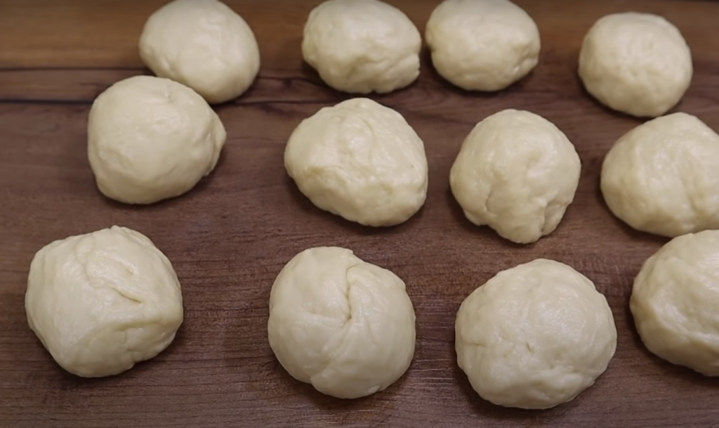 Każdą kulkę rozwałkuj w kształcie okręgu, zrób nacięcie do połowy i wyłóż nadzienie. Ciasto zawijaj w stronę nacięcia do powstania małej bułeczki.
