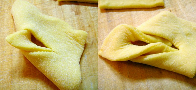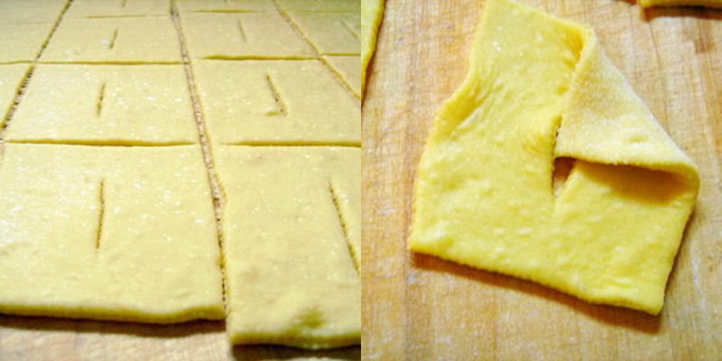 Po przestudzeniu, stopniowo dodawaj masło do masy. Ciasto dokładnie ugnieć i odstaw pod przykryciem na 30 min. Ciasto podziel na części. Każdą z nich rozwałkuj na grubość ok. 0,5 cm i pokrój w prostokąty.