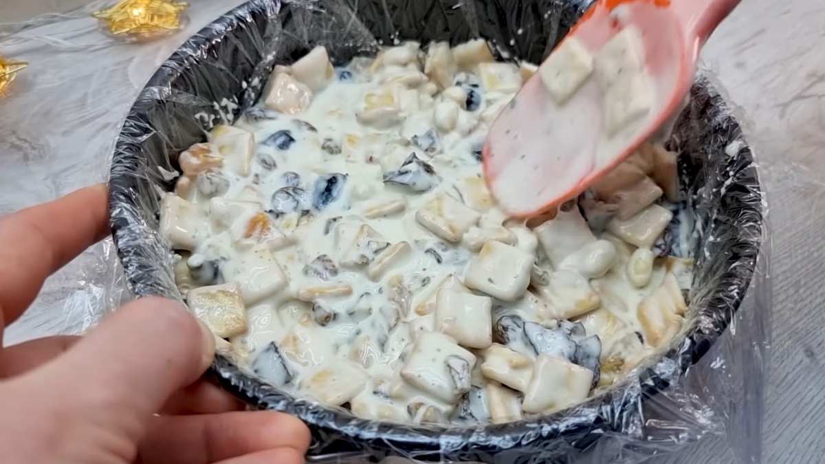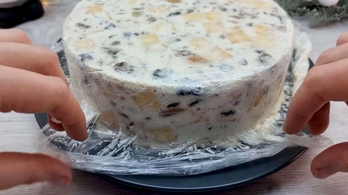 Formę przykryć folią spożywczą po czym umieścić na niej przygotowaną masę. Następnie przykryć ją pod ciężarem np. deską.