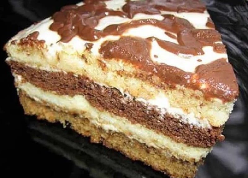 Przygotuj krem. Śmietanę ubij z cukrem na gładką masę. Pierwszy kawałek biszkoptu połóż na tacce. Posmaruj ¼ kremu. Połóż na to ciemny kawałek. I powtarzaj aż do wyczerpania składników. Wierzch możesz posypać startą czekoladą lub ulubionymi dodatkami. Ciasto włóż do lodówki na 3-4 h.