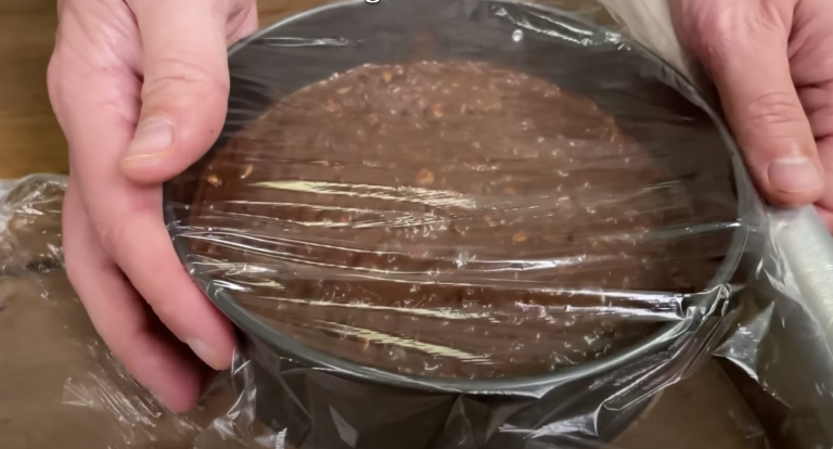 Formę można wcześniej wyłożyć papierem lub posmarować masłem. Ciasto, które zostało przelane do formy, należy wygładzić i przykryć dokładnie folią.