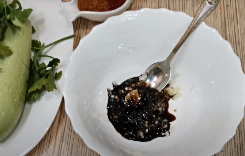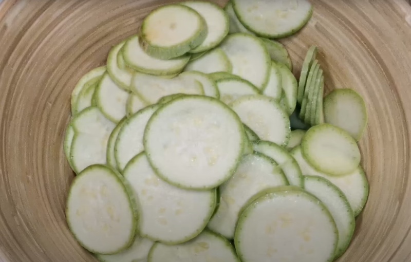 Cukinię pokroić w bardzo cienkie plastry. Najlepiej wybierać do tej potrawy młode egzemplarze bez zawiązanych gniazd nasiennych w środku. Duże cukinie należy pokroić w pół pierścienie. Umieścić w misce i dodać 1 łyżeczkę soli. Wymieszać i odstawić na ok. 30 minut.