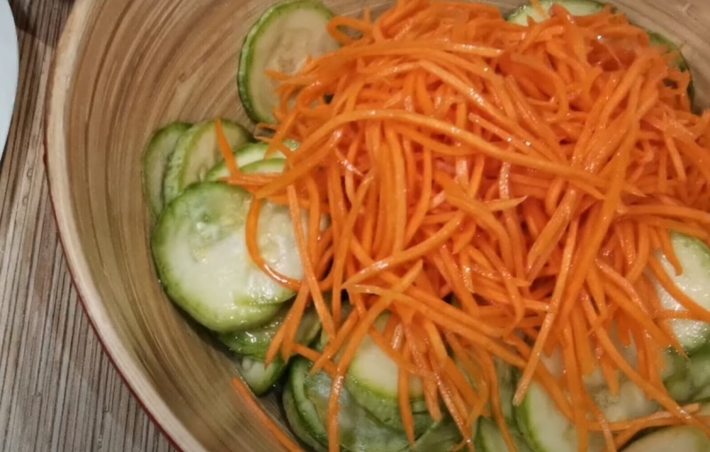 Marchew obrać i pokroić w paski. Można użyć specjalnej tarki do siekania marchwi „po koreańsku”. Marchew włożyć do osobnej miski, wsypać szczyptę soli i wymieszać. Odstawić, podobnie jak cukinię na 30 minut. Czosnek obrać i przecisnąć przez praskę. Wlać sos sojowy, sok z cytryny i dodać miód. Wszystkie składniki połączyć wraz z papryką w proszku.