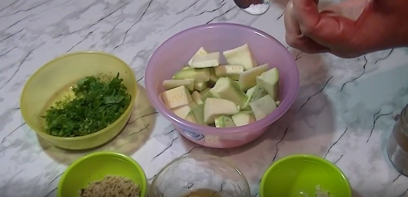 Cukinię należy umyć, obrać ze skórki, usunąć z niej nasiona. Jeżeli cukinia jest młoda, nie ma potrzeby usuwania skórki i drobnych nasion. Następnie kroimy cukinię na małe (nie bardzo drobne) kawałki, np. w kostkę.