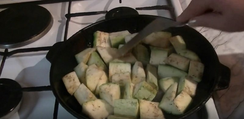 Smażymy, przewracając kawałki warzywa, na złoty kolor. Należy uważać, aby kawałki cukinii nie zamieniły się w papkę.