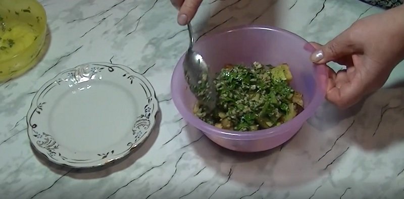 Tak usmażoną cukinię układamy w naczyniu. Następnie przeciskamy czosnek przez prasę, myjemy i siekamy pietruszkę i rozdrabniamy (miażdżymy) orzechy włoskie.