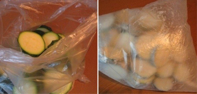 Obie cukinie dokładnie umyj i pokrój w plastry. Możesz też obrać warzywo przed umyciem i pokrojeniem – nie wpłynie to w żaden sposób na efekt końcowy. Mąkę, sól oraz pieprz wsyp do plastikowej torby. Wcześniej upewnij się, że nie ma ona dziur, a także że jest na tyle mocna aby nie rozerwać się w trakcie przygotowywania.