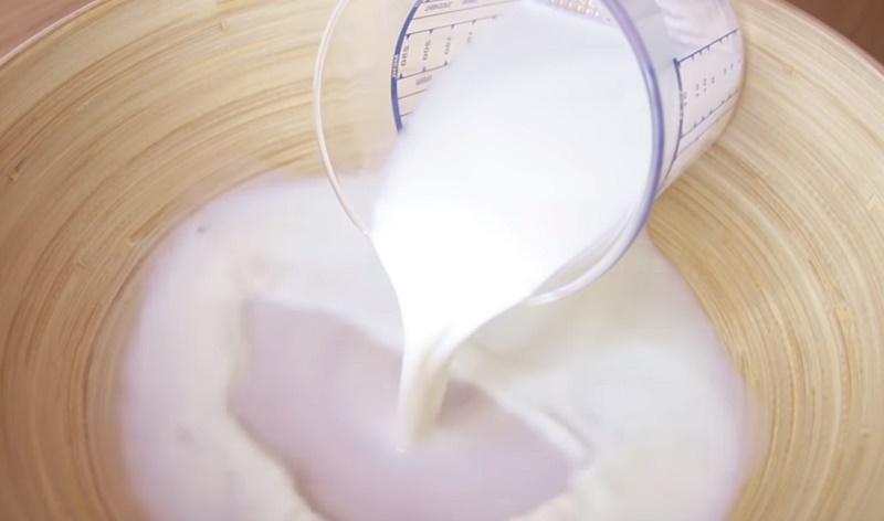 Na początku wlej ciepłe mleko do miski, dodaj drożdże i cukier. Dokładnie wymieszaj, przykryj folią aluminiową i pozostaw na 10 minut.