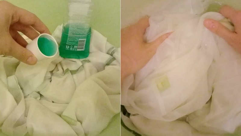 Najpierw energicznie potrząśnij firaną lub zasłoną, aby usunąć największy kurz z zewnątrz. Potem włóż materiał do głębokiego pojemnika i napełnij go wodą. Do pojemnika wlej 30 ml płynu do płukania jamy ustnej i odczekaj dziesięć minut.