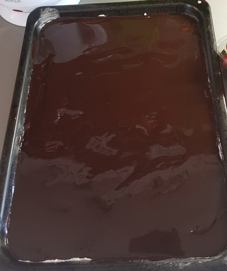 Na sam koniec przygotuj polewę. Śmietankę podgrzej i cały czas mieszając, dodawaj do niej połamaną czekoladę. Proces ten możesz przeprowadzić także w mikrofali, wówczas czas przygotowania znacząco się skróci. Polewą udekoruj cały deser. Podawaj po jej stwardnięciu.