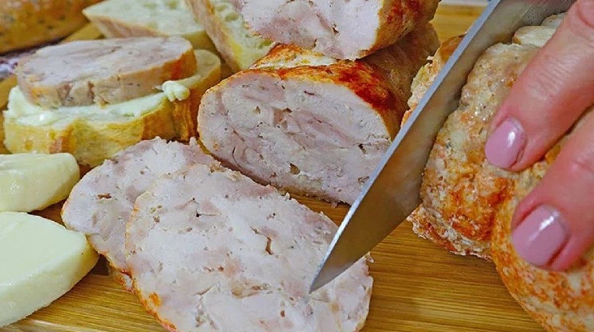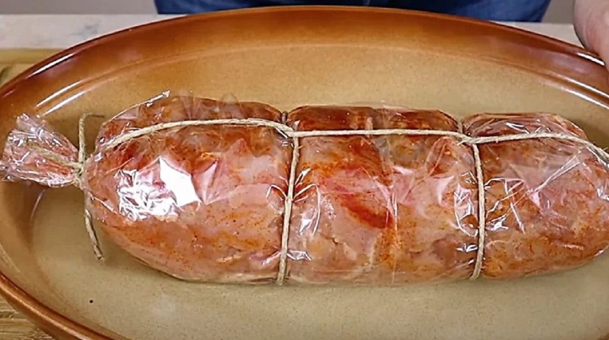 Przygotować folię spożywczą do zawinięcia kiełbasy. Można ją posypać papryką lub innymi przyprawami. Mięso umieszczamy w folii, zwijamy w rolkę, którą owijamy sznurkiem. Nagrzewamy piekarnik do temperatury 180 stopni. Zwiniętą roladę pieczemy w piekarniku przez godzinę.