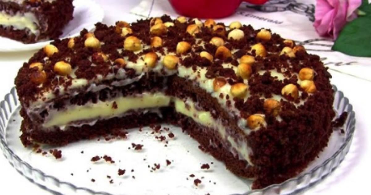 Do garnka wrzucić pokrojone w mniejsze kawałki masło, a po wymieszaniu wszystkiego razem pozostawić do ostygnięcia. Kiedy upieczone ciasto ostygnie, przekroić je na 2 równe części. Na jedną z nich będącą w formie do pieczenia wylać jedną część kremu, który należy przykryć drugą częścią ciasta.