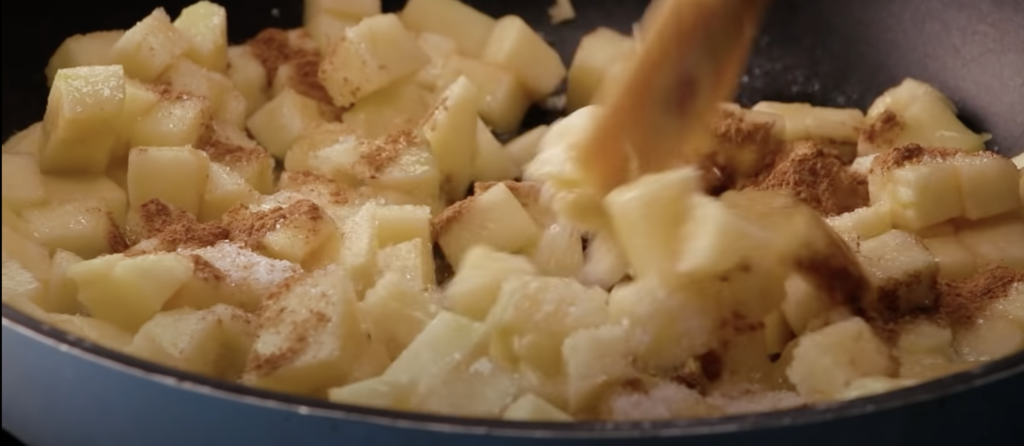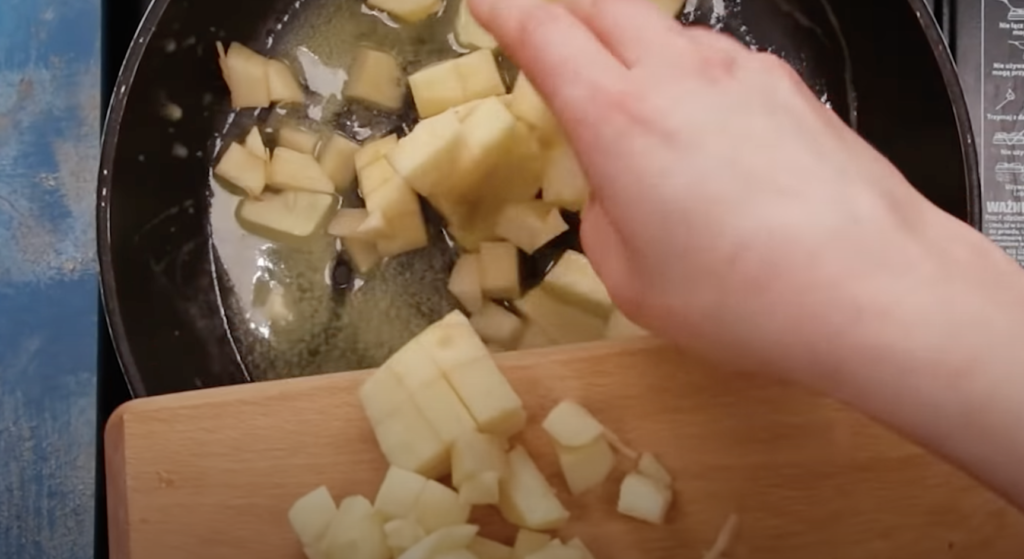 Następnie rozpuszczamy masło na patelni i dodajemy wcześniej przygotowane jabłka, cynamon i bardzo dokładnie mieszamy.