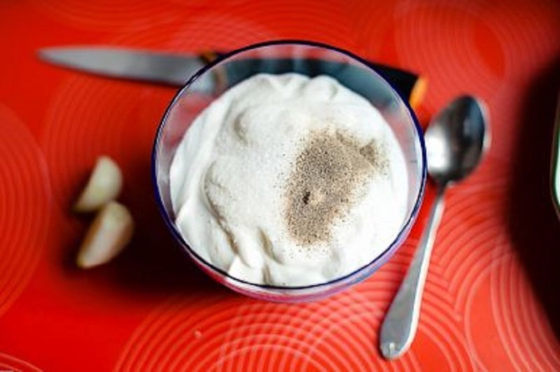 W miseczce połącz ze sobą jogurt i majonez. Wyciśnij  do tego czosnek przez praskę. Dodaj do tego przyprawy. Weź większą miskę i wsyp do niego ogórki, kalafiora, sos czosnkowy i koperek. Wszystko dobrze wymieszaj ze sobą.