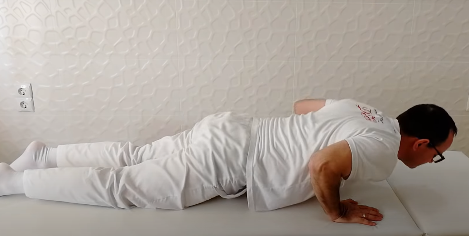 Połóż się na brzuchu. Ugnij łokcie i połóż dłonie na klatce piersiowej. Unieś górną część ciała i odepchnij dłonie od podłoża. Następnie wyciągnij ręce najdalej, jak potrafisz i przyciągnij pośladki do pięt.