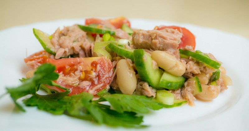 Po dokładnym umyciu warzyw pokrój je w drobną kosteczkę. Odcedź fasolkę i umieść ją w salaterce razem z pomidorami i ogórkami. Tuńczyka rozdrobnij za pomocą widelca i wsyp do warzyw. Jako dekorację wykorzystaj pokrojoną w piórka cebulę. Całość dopraw solą, pieprzem i ziołami.