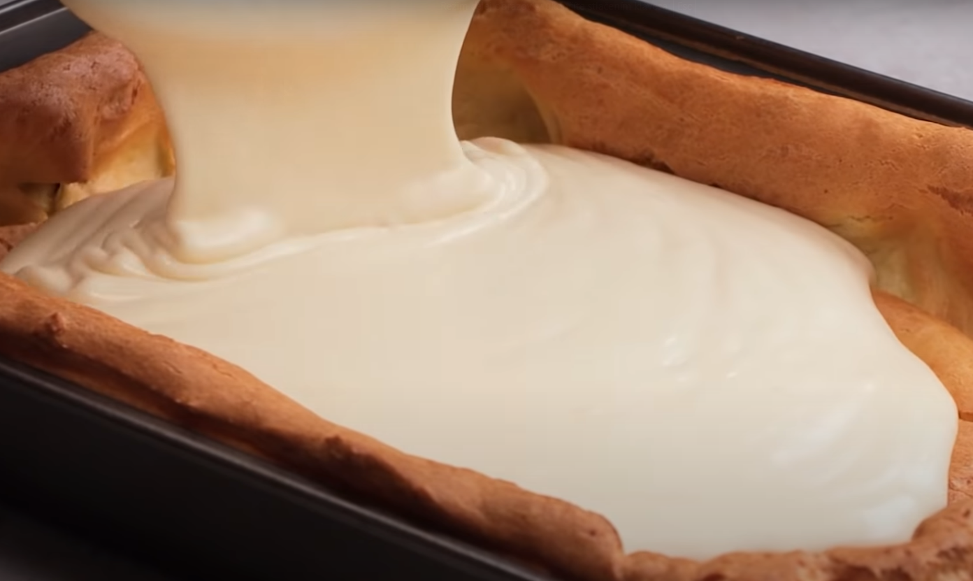 Do upieczonego ciasta wlej gotowy krem a całość wstaw na 2 godziny do lodówki.