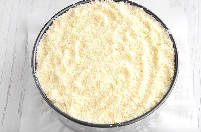 Formę do pieczenia (około 18 cm) wyłóż papierem do pieczenia. Nałóż połowę ciasta, rozłóż jednolicie, ubij delikatnie. Drugą połowę zetrzyj na tarce lub pokrusz dokładnie na drobne kawałeczki.