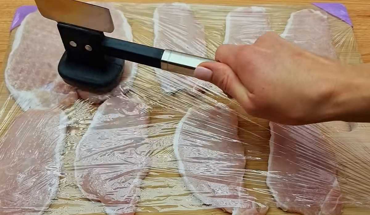 Mięso pokroić w cienkie paski. Przy pomocy tłuczka rozbić mięso. Przykryć folią aluminiową. Przyprawić mięso z obu stron przygotowanymi przyprawami.