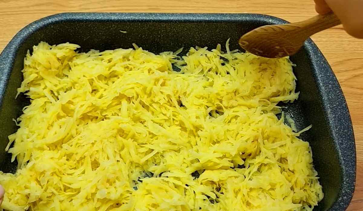 Na wierzchu ułożyć starte ziemniaki. Następnie pokroić cebulę w krążki i ułożyć ją na wierzchu. Następnie ułożyć cienko pokrojone mięso.