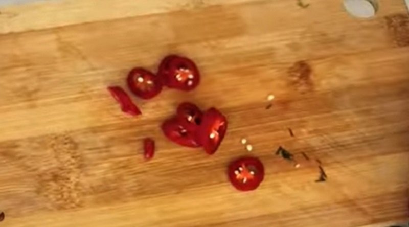 Następnie należy zabrać się za posiekanie papryczki chili i koperku. Trzy ząbki czosnku należy zetrzeć na jednolitą masę.