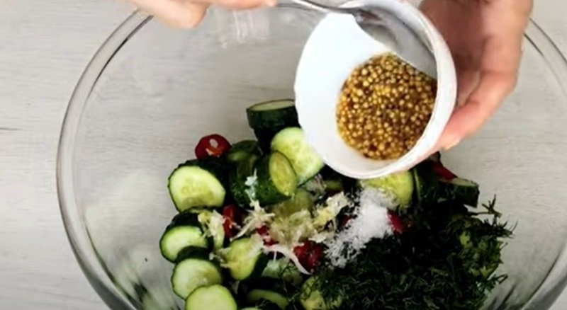 Ogórki, paprykę, koper i czosnek wymieszać w dużym naczyniu, a następnie zalać całość 25 mililitrami wody i taką samą ilością oleju roślinnego (można wykorzystać olej rzepakowy lub słonecznikowy).