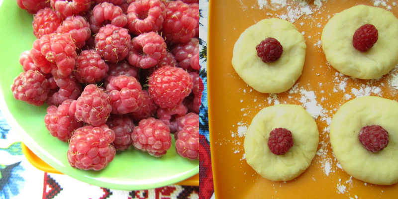 Każdy kawałek należy spłaszczyć dłonią i na środku umieścić maliny. Kolejno trzeba złączyć krawędzie oraz zwinąć ciasto w kulkę.
