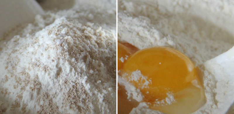 Do wysokiej miski wsyp: mąkę, kasze manną, drożdże, sodę i sól, wymieszaj i dodaj jajko, jeszcze raz wszystko pomieszaj.