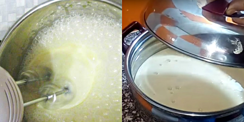 Do tak przygotowanych składników wlej ciepłą wodę i olej i dokładnie mieszaj mikserem, przez około 2 minuty, do czasu powstania dość wodnistego ciasta.
