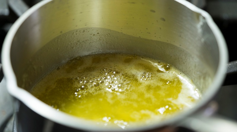 W garnku roztop masło i dodaj do niego miód, mieszaj do czasu aż składniki się połączą, pamiętaj aby nie doprowadzić do zagotowania sosu.