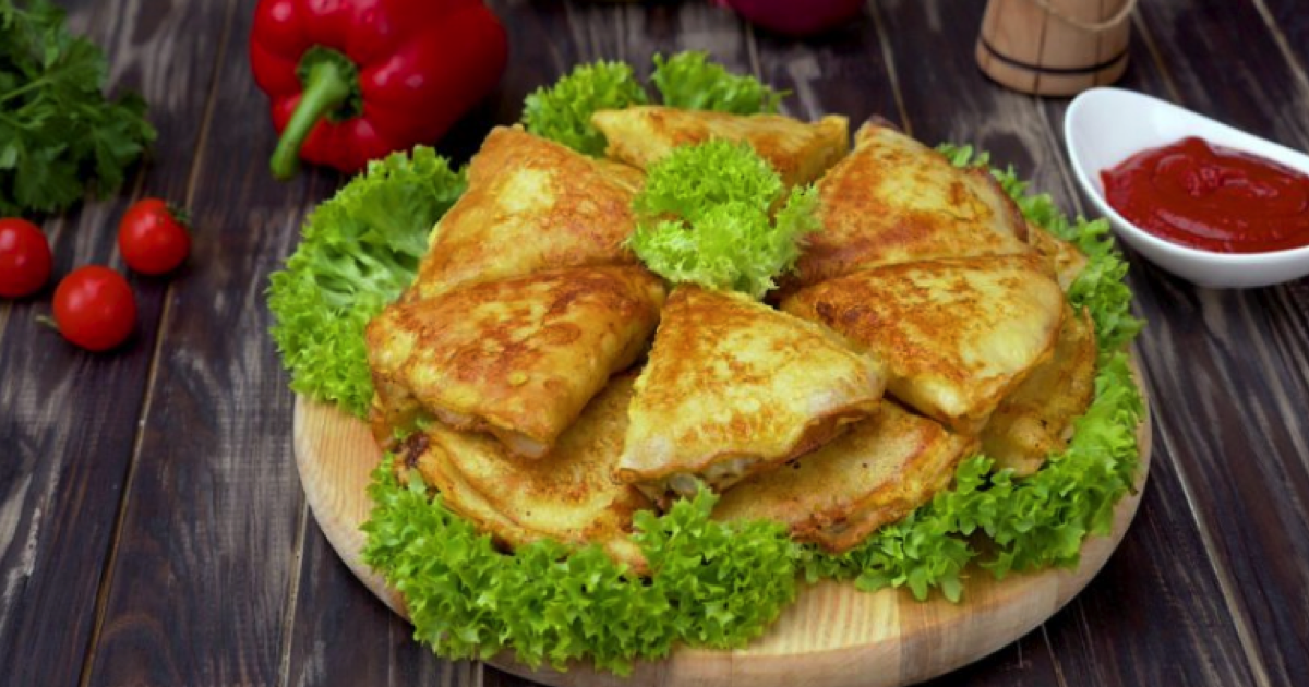 Naleśniki przekrój na połowę i ułóż na wszystkich porcję nadzienia, a na koniec zawiń w trójkąt. W kolejnym etapie ubij za pomocą widelca 50 ml mleka, 3 jajka i sól. Naleśniki obtocz w przygotowanym cieście i usmaż na patelni na małym gazie na rozgrzanym oleju słonecznikowym.