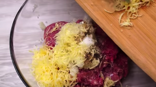 Polecam klasyczną metodą „rączkami”. Zetrzyj na drobno na tarce żółty ser i dodaj do mięsa. Powstały farsz odstaw na chwilę, żeby składniki się „przegryzły”.