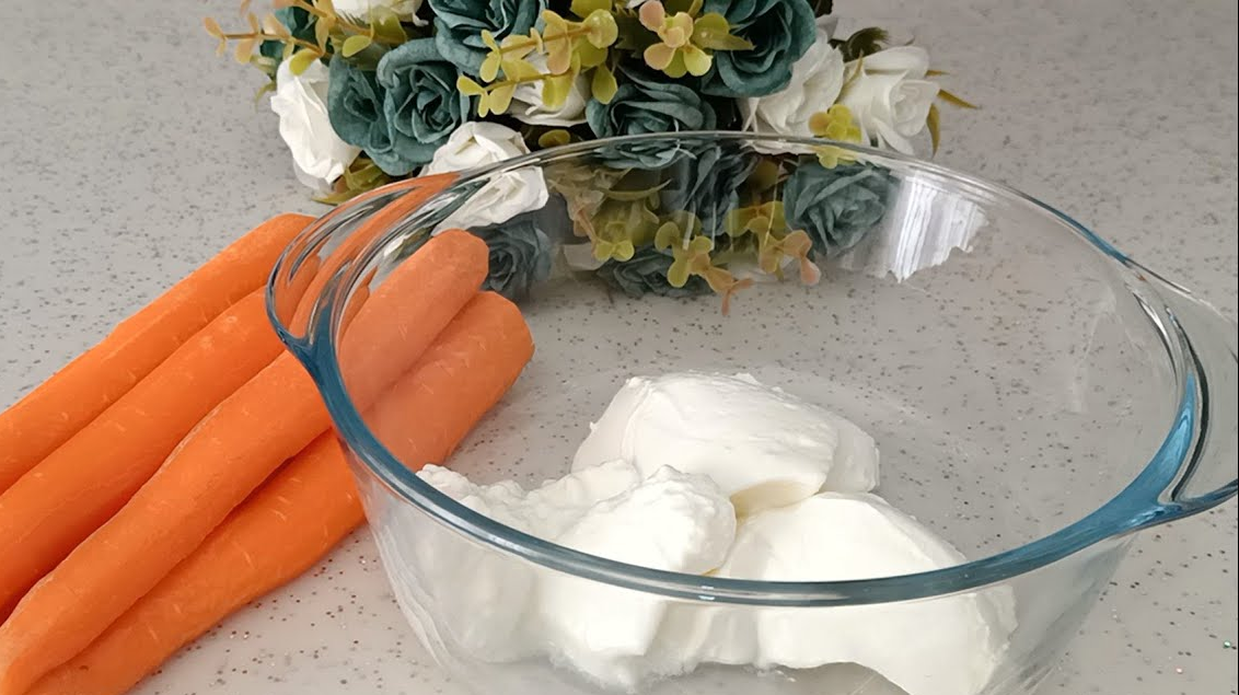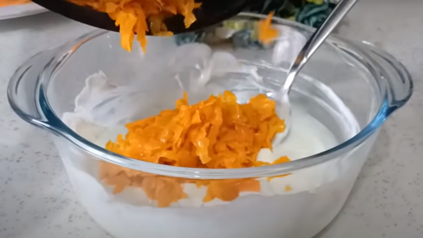 Na patelnię wlej odrobinę oleju i podsmaż startą marchewkę aż do momentu gdy będzie miękka. W międzyczasie w miseczce wymieszaj jogurt naturalny z majonezem i posiekanym ząbkiem czosnku.