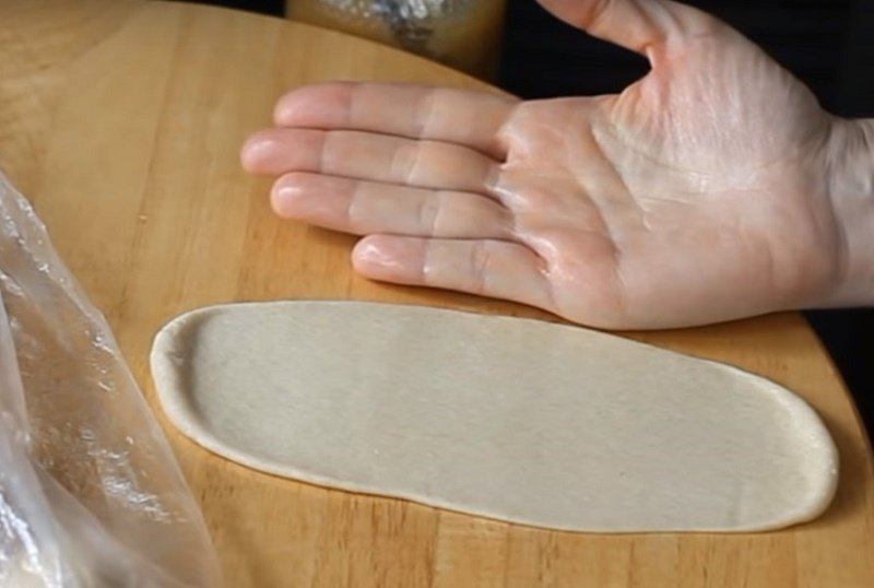 Przygotowane ciasto podzielić na około 12 części. Każdą uformować w kulkę, przykryć ściereczką i pozostawić na 10 minut. Każdą z uformowanych kulek rozwałkować na podłużny placek (trochę dłuższy niż dłoń).
