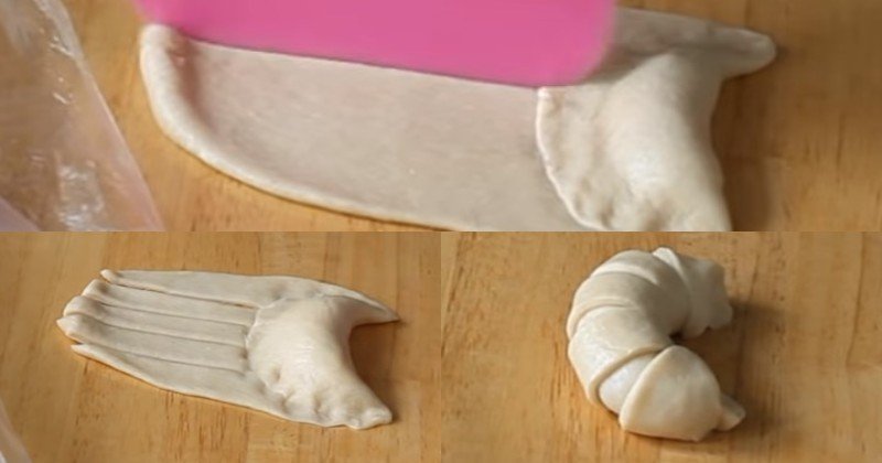 Na jednej krawędzi ułożyć dżem i złączyć krawędzie w taki sposób, aby nie wyciekł. Z drugiej strony wykonać cztery nacięcia i zawinąć rogaliki.