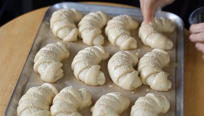 Nagrzać piekarnik do 180 stopni. Rogaliki ułożyć na blaszce wyłożonej pergaminem i odstawić na około 20 minut.