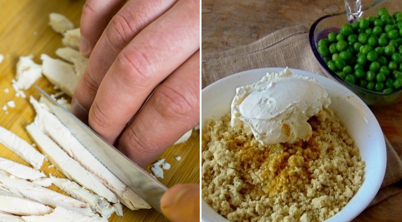 Filet z kurczaka ugotuj i posiekaj na paski lub w kostkę. Dodaj do kurczaka sól, pieprz, inne przyprawy oraz serek śmietankowy i ugotowany wcześniej zielony groszek. Możesz go wrzucić w całości, albo posiekać jak kurczaka. Wymieszaj dokładnie wszystkie składniki, które będą podstawą naszej rolady.
