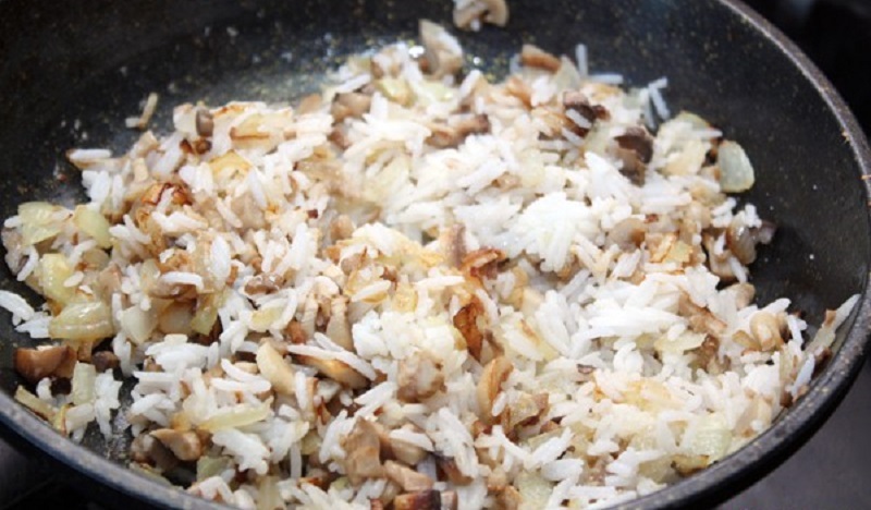 Cebulę pokrój w drobną kostkę, a czosnek posiekaj lub przeciśnij przez praskę. Podsmaż je na oliwie z oliwek. Następnie obierz i pokrój na mniejsze kawałki pieczarki. Wrzuć je na patelnię z cebulą i czosnkiem. Smaż wszystko do czasu, aż woda wyparuje z pieczarek.