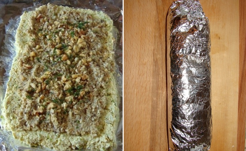 Zwiń wszystko w roladę przy pomocy folii i wstaw do lodówki na co najmniej godzinę. Zanim podasz potrawę na stół możesz ją jeszcze udekorować ziołami, granatem, albo żurawiną.