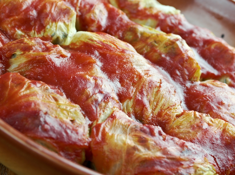 Następnie gotujemy ryż na półtwardo. Następnie kroimy cebulę na małe kawałki, ścieramy na tarce z drobnymi oczkami marchewkę i podsmażamy wszystko na patelni. Następnie mieszamy warzywa z ryżem, dodajemy także mięso mielone i doprawiamy całość ulubionymi przyprawami. Tak przygotowanym farszem napełniamy liście kapusty. Zawijamy je jak tradycyjne gołąbki.