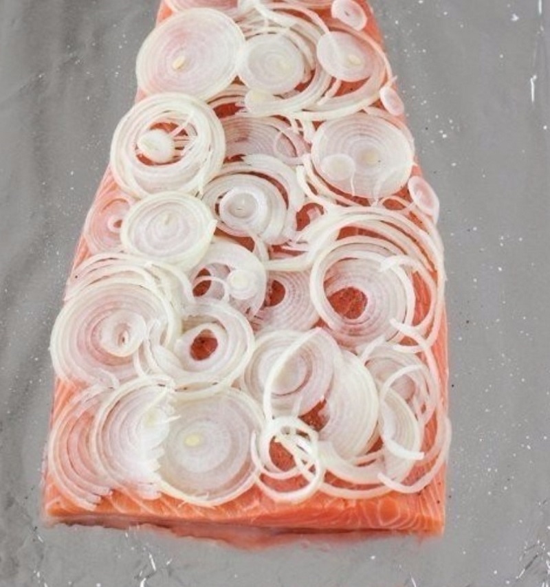 Po obraniu cebulę kroimy na cienkie plasterki, które w następnej kolejności rozkładamy na całej rybie. Majonez, musztarda, sok z cytryny oraz czosnek łączymy razem. Całość po wymieszaniu umieszczamy na wierzchu pokrytego cebulą łososia.
