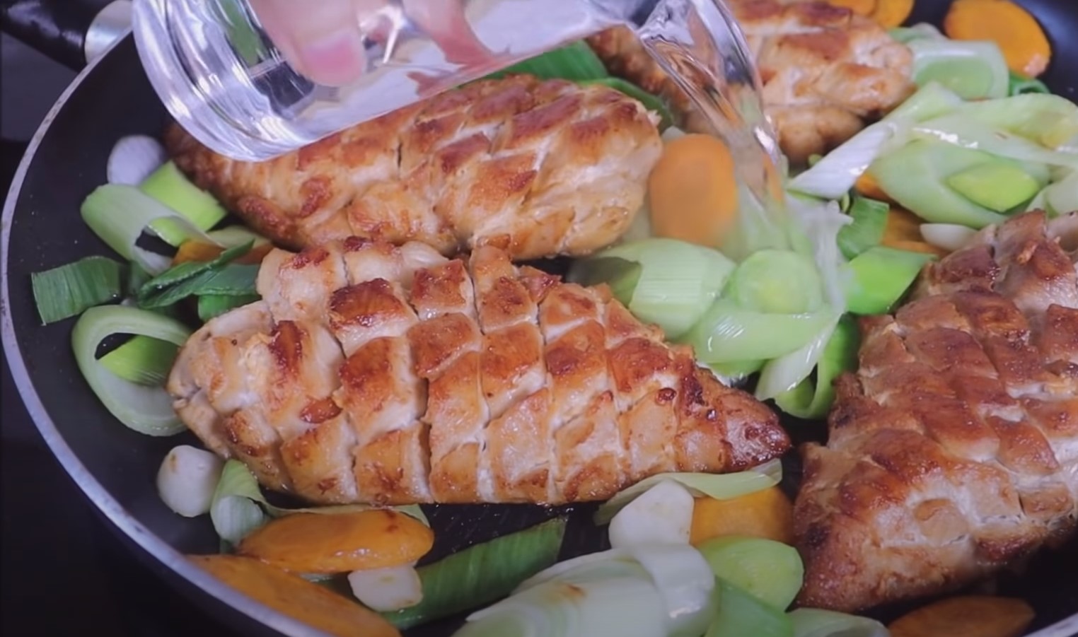 Upieczone piersi z kurczaka ułożyć na patelni. Na patelnię wlać trzy szklanki wody.