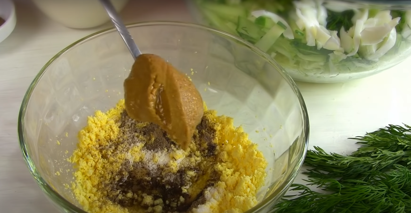 Wszystkie warzywa należy dokładnie umyć. Ogórek i kapustę należy pokroić w paski. Umieść wszystkie składniki w misce. Dodać posiekany koperek, kolendrę i sól. Ugotowane jajka należy oddzielić – żółtko i białko muszą być oddzielone. Białka pokroić na małe kawałki, a następnie rozgnieść żółtka widelcem.