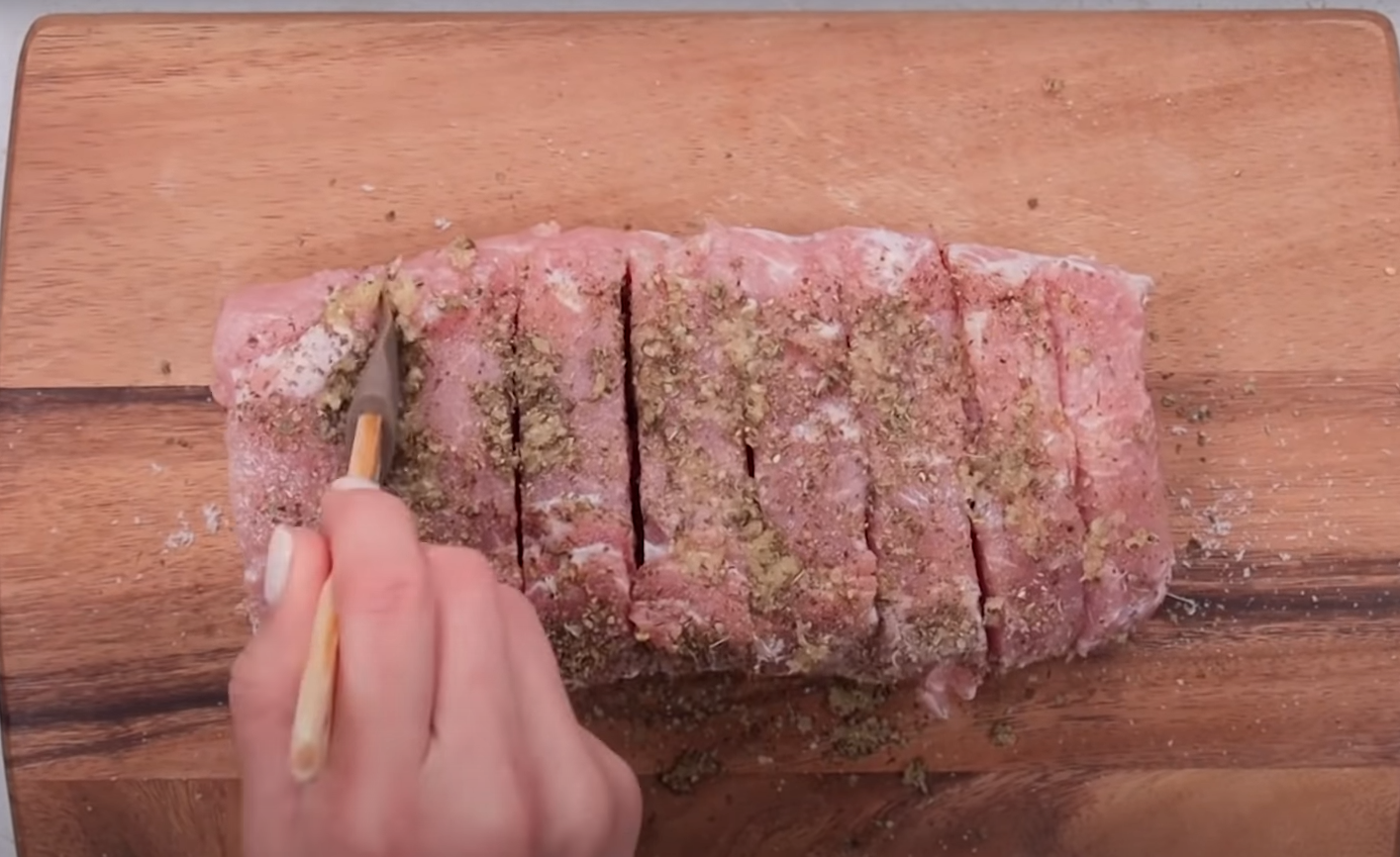 Do nacięcia dodajemy sól, pieprz i majeranek. Następnie natrzeć go przeciśniętym przez praskę czosnkiem.