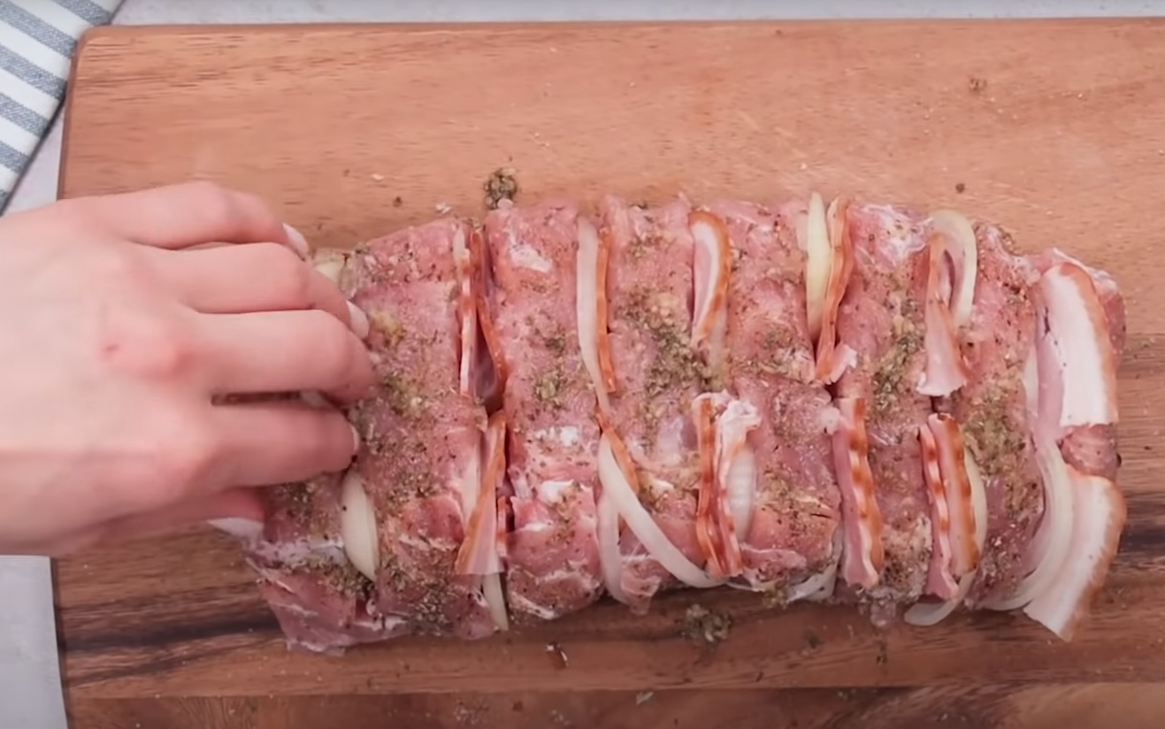 Boczek pokroić w plastry, a cebulę na pół. Do każdego plastra dodajemy zarówno boczek, jak i cebulę.