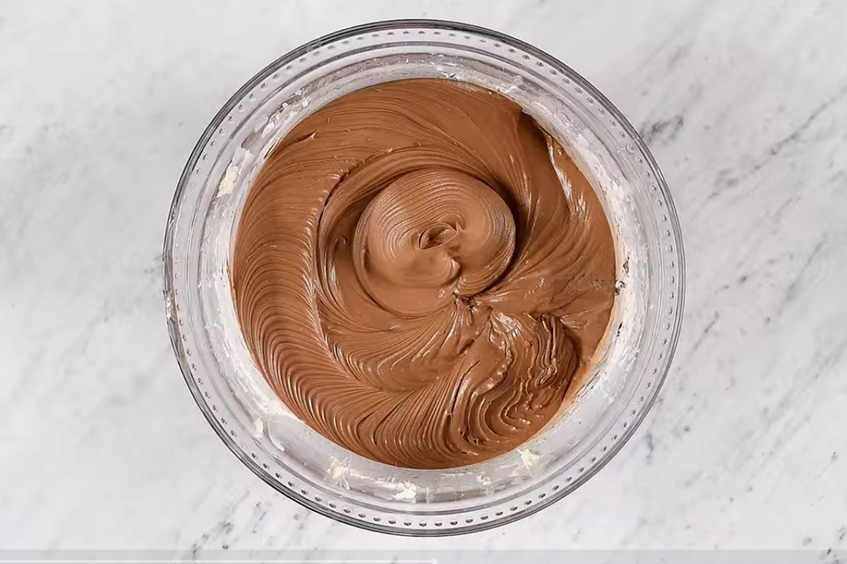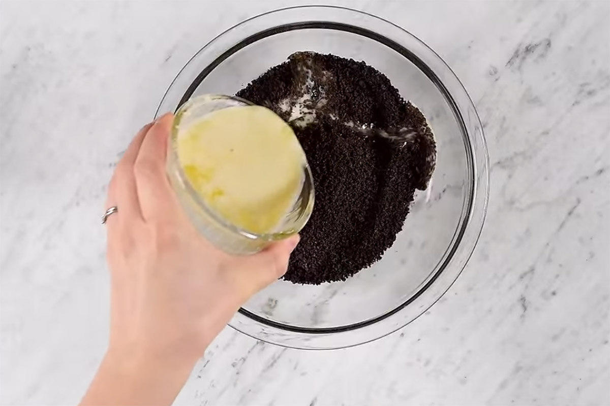 Ciasteczka czekoladowe dokładnie rozdrabniamy przy pomocy blendera. Rozpuszczamy masło i wlewamy do ciasteczek – mieszamy.