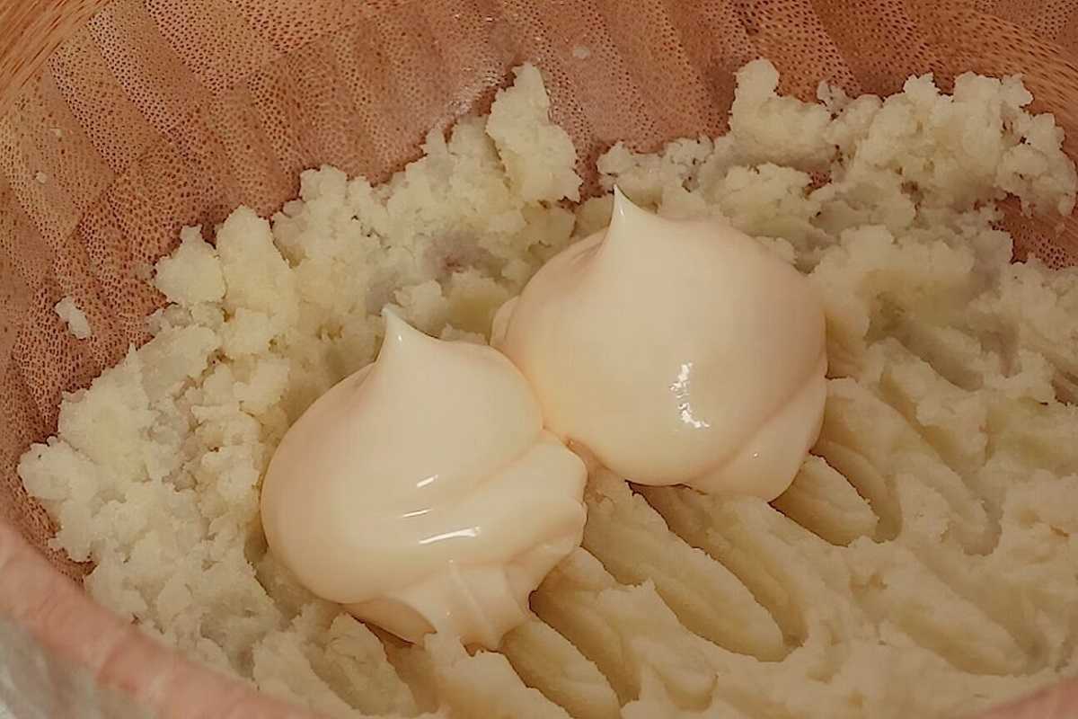 Ugotuj ziemniaki przez kilka minut, a następnie zetrzyj je na tarce. Wymieszaj majonez z ziemniakami.