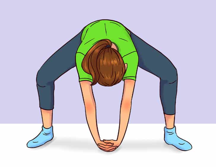 Połóż stopy na ziemi. Połóż stopy na podłodze, rozstawiając je na szerokość bioder. Palce stóp powinny być skierowane na boki. Kolana trzymaj ugięte. Wyciągnij ręce jak najwyżej i unieś je do góry. Powoli pochyl się do przodu tak, aby dłonie dotknęły podłogi.